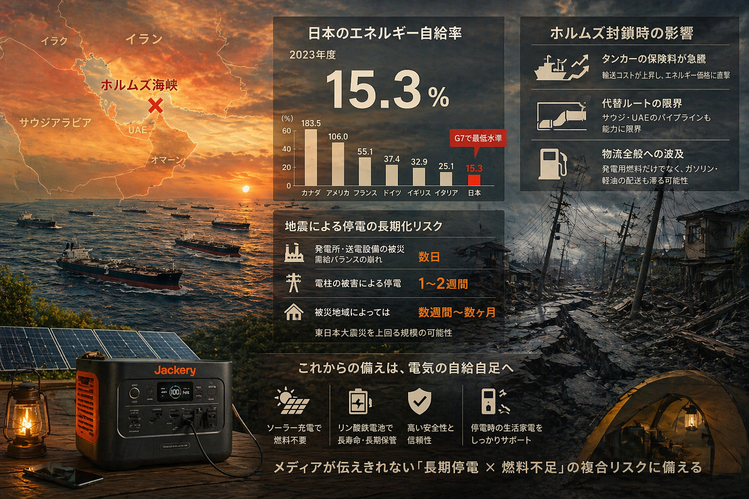 ホルムズ海峡封鎖のリスクに備える!Jackeryポータブル電源の最適解