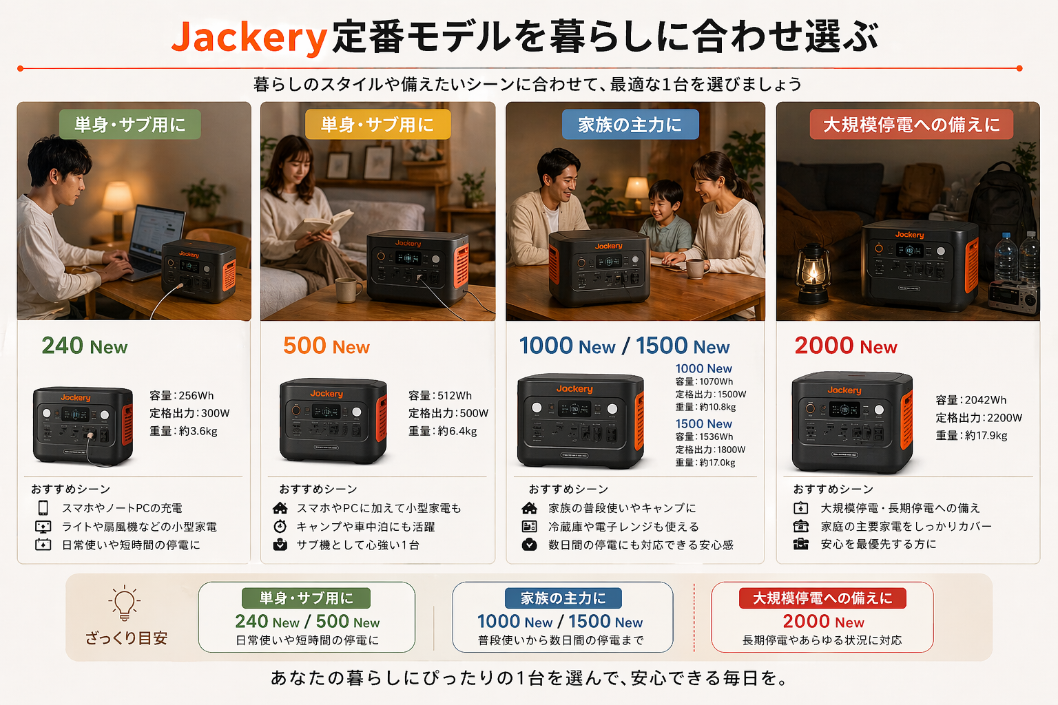 ざっくりとした目安としては、単身やサブ用なら240 Newや500 New、家族の主力なら1000 Newや1500 New、大規模停電への備えなら2000 Newといった区分け。