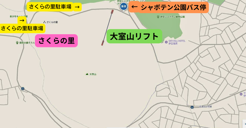 最寄りのバス停は「シャボテン公園前」(さくらの里から徒歩約5分)で、ここから伊豆高原駅まで約16〜20分、片道430円です。