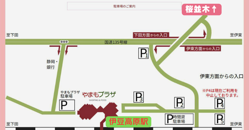 対策としては、カーナビやGoogleマップの目的地を「伊豆高原駅P2」または「伊豆高原駅P3」と明確に指定し、国道135号から駅入口の看板のみに従って進むことです。
