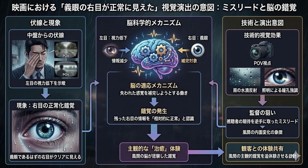 映画後半の雨のシーンで風間公親の右目が治ったように見えた謎を整理