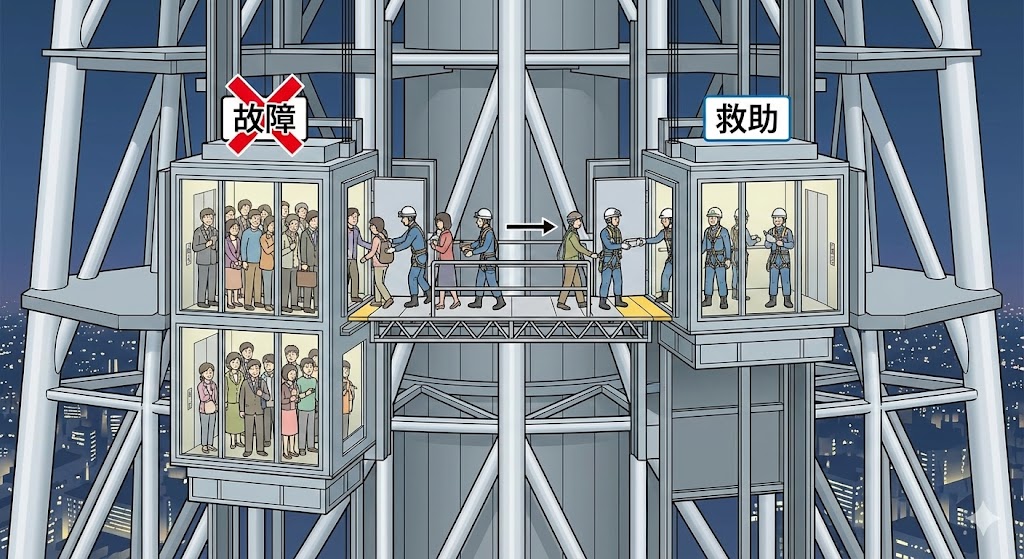 それが、隣接するエレベーターを使った横移動による救出作戦だったのです。